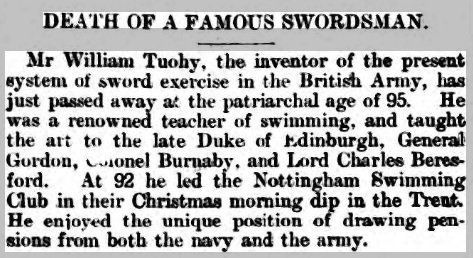 William Tuohy had obviously settled in Nottingham for quite some time, as mentioned above, though he died back in Portsmouth at the good age of 95. It is quite extraordinary to think that the same man who taught so many people swordsmanship and created the regulation system of three decades' service, also taught such an impressive array of individuals how to swim. He certainly seems to have lived a full life.