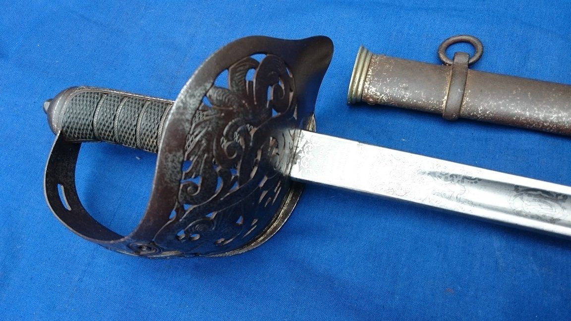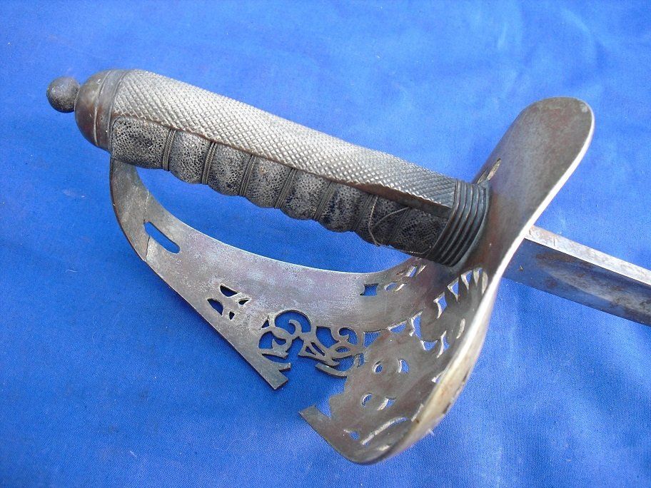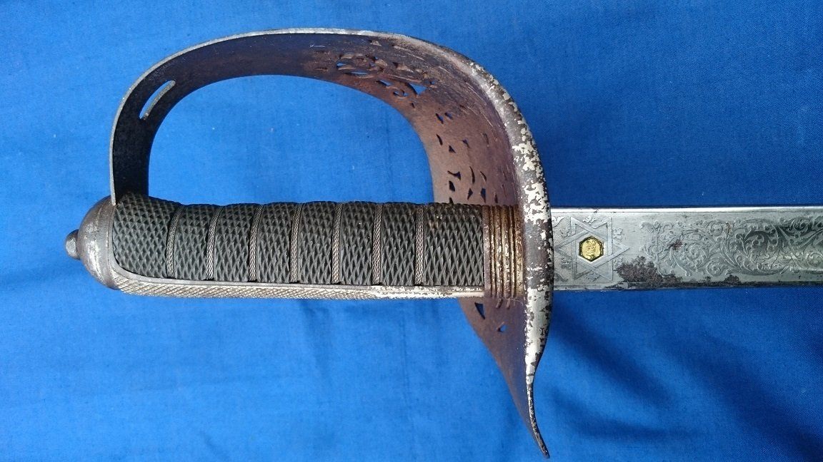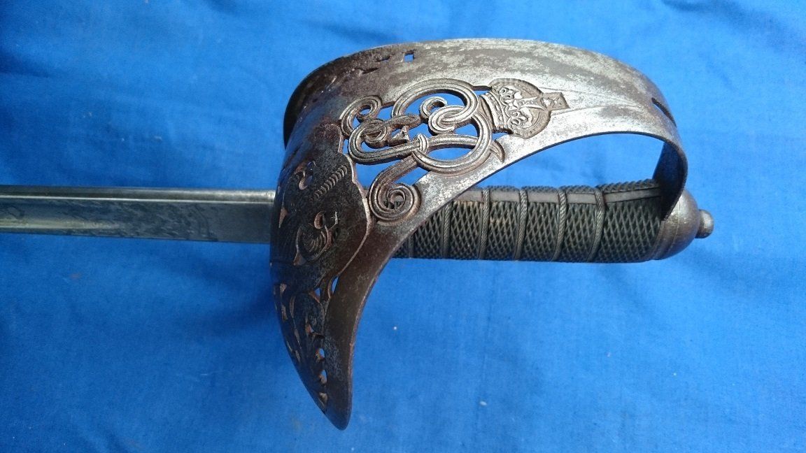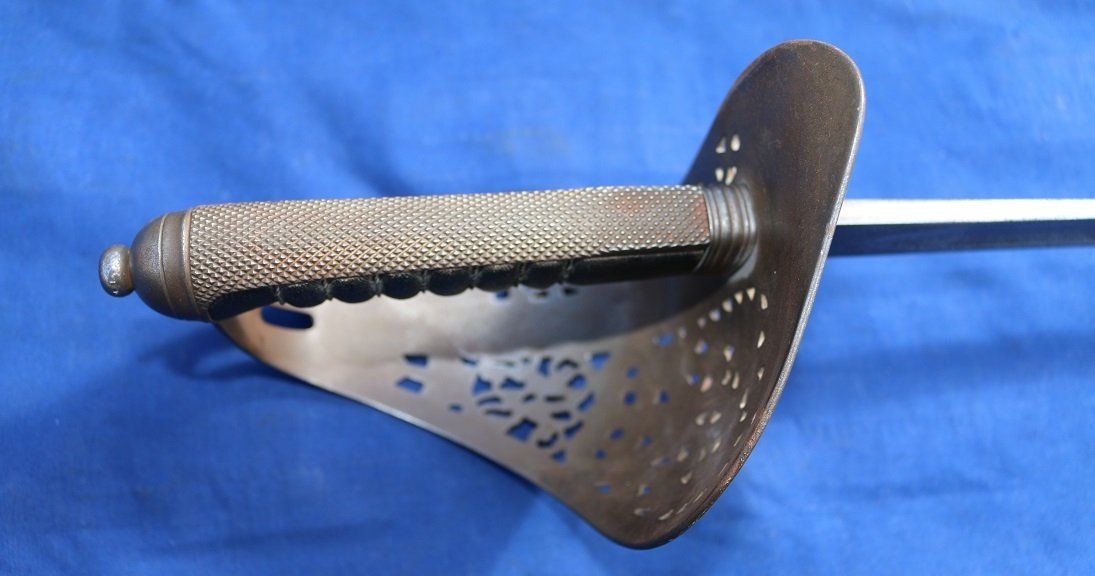 A Typical 1845 Pattern Infantry Officer's Sword of the 1880s (folding guard abandoned by 1860, blade and grip generally straighter on later examples, the backstrap usually having a chequered thumb-placer):