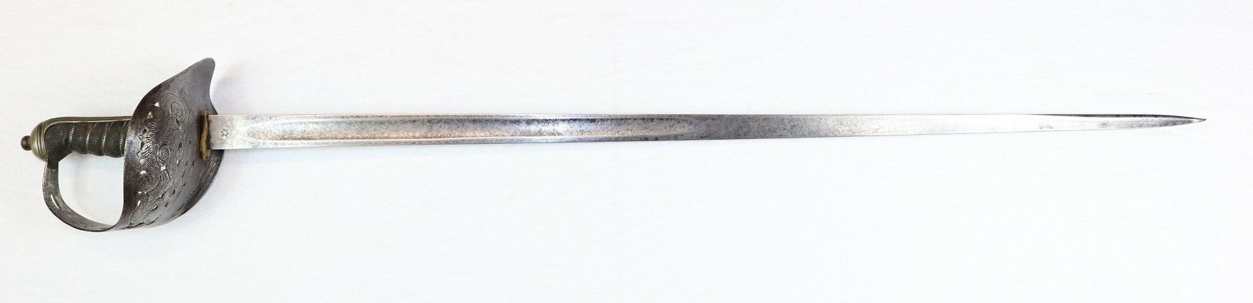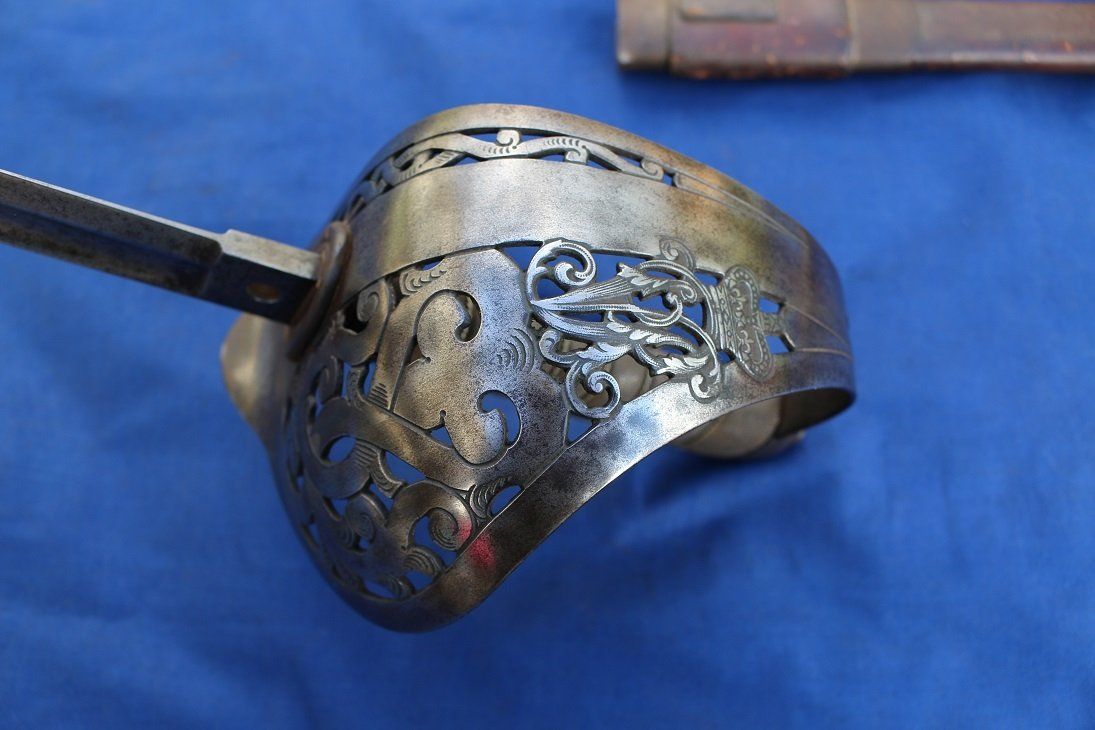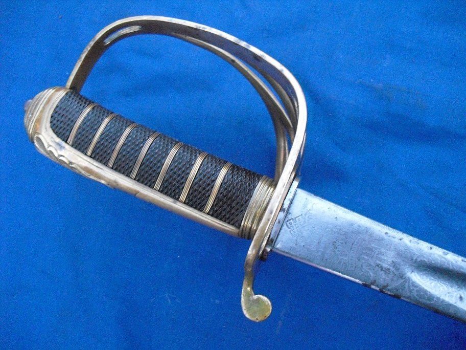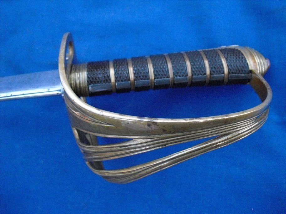 A Typical 1845 Pattern Infantry Officer's Sword of the 1880s (folding guard abandoned by 1860, blade and grip generally straighter on later examples, the backstrap usually having a chequered thumb-placer):