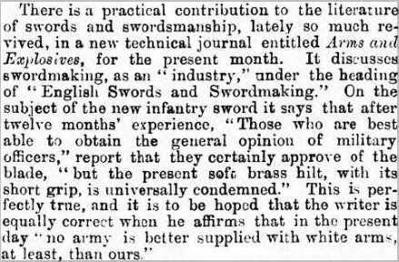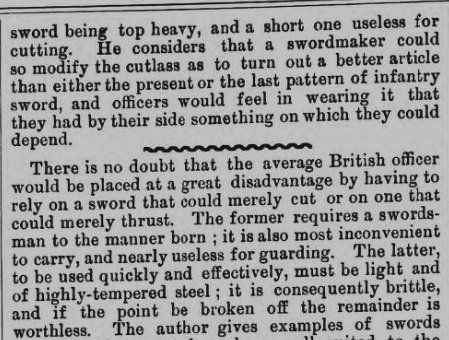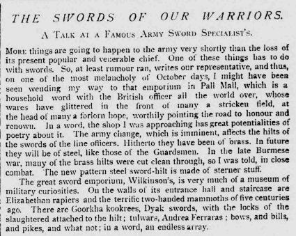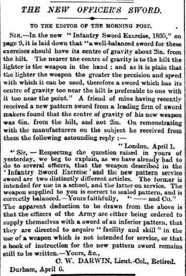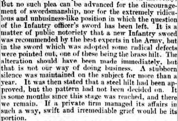 A particular criticism levelled at the new Infantry Sword Exercise of 1895, as highlighted by Hutton and others above, was that it specified a type of practice sword (modelled on Italian gymnasium practice sabres of the time), which rather differed in weight and balance to the actual infantry officer's new regulation sword. The practice sword was both lighter and balanced more closely to the hilt. This was highlighted in the article below featured in the Morning Post of 7 Apr 1896 - the manufacturer in question was almost certainly Wilkinson:
