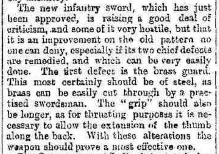 The Freeman's Journal of 3 Apr 1893 also highlighted the complaints against the old brass hilt and the desire for a new steel one with a longer grip: