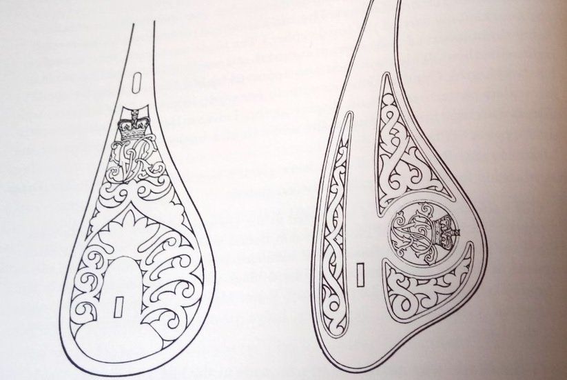 John Wilkinson Latham (British Military Swords) shares two images of proposed alternative designs for the new steel hilt, from the Wilkinson Sword Company records. He goes on to relate a word of mouth anecdote which suggests that the War Department commissioned both Wilkinson and Mole to submit prototypes for testing and approval. The left example is clearly based on the heavy cavalry officers' hilts and the right hand example is close to the final 1895 pattern, but with a cartouche for the Royal cypher which harks back to the earlier Gothic hilts: