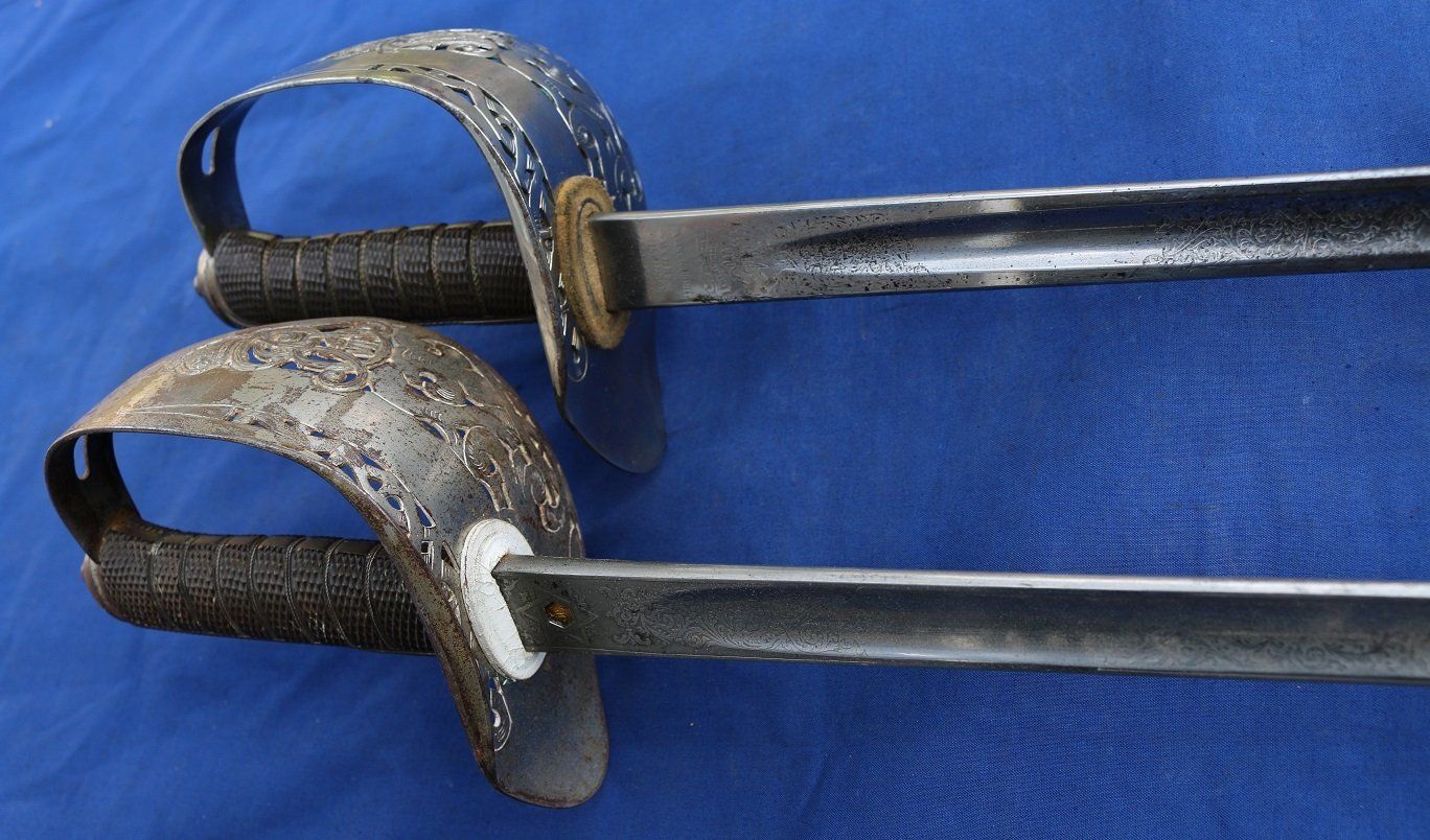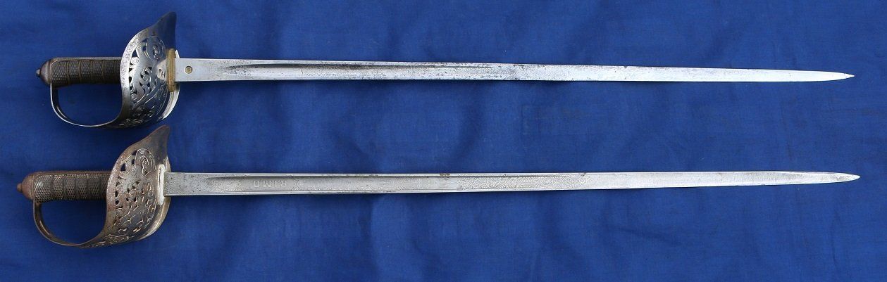 Two more Wilkinson examples of the 1897 pattern with Patent Solid Hilts, the upper one Victorian and the other Edward VII. The latter is service sharpened and was carried in WW1, its owner losing his life to a German marksman in 1914. Note the different grip lengths. Purchasers could choose their grip size, as well as changing other minor details as they wished. Also note that the hexagonal 'best quality' proof slugs of Wilkinson were placed on the inside of the blades, in contrast to the standard circular proof slugs which were placed on the outside of the blade: