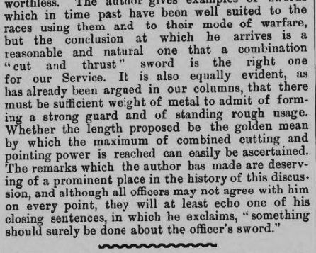 The assertion by some more recent authors that the final British Army regulation infantry officer's sword was the finest design ever produced seems over-enthusiastic. Assessments from the period when the sword was still occasionally used as a weapon were mixed. Some authorities did indeed approve strongly of the new weapon, while some others thought that the design had either not gone far enough towards thrusting specialisation, or had gone too far and that a cut and thrust blade would still have been better.