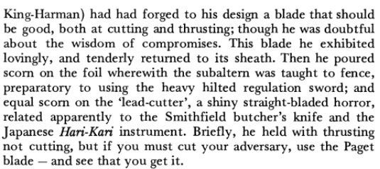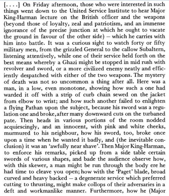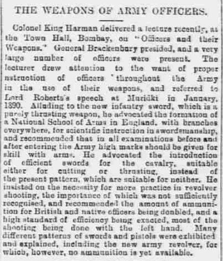 Rudyard Kipling reports in his "Simla Notes" Civil and Military Gazette attributed to 22 July 1885 a lecture given by (the Major) King-Harman on the subject of swords: