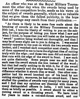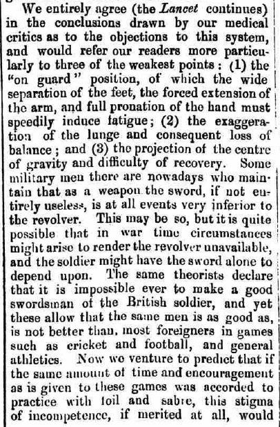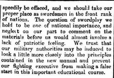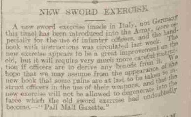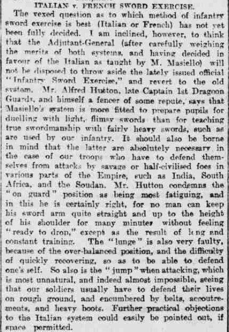 The question of whether the method of Masiello was suited to the new British regulation infantry officers' swords continued and the flames were fanned by Captain Alfred Hutton's published misgivings in 1896, as shown here in the Leeds Mercury from 13 Jun 1896: