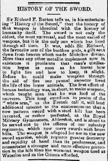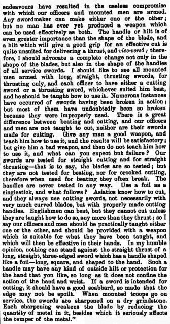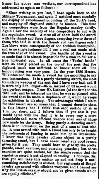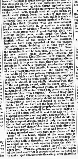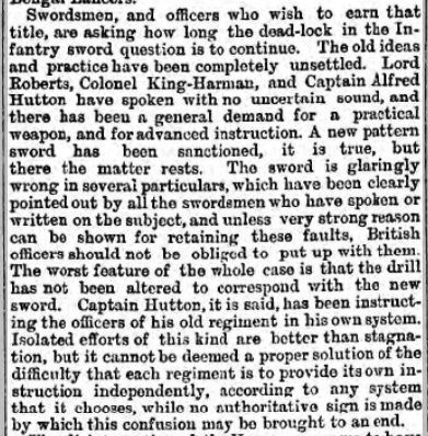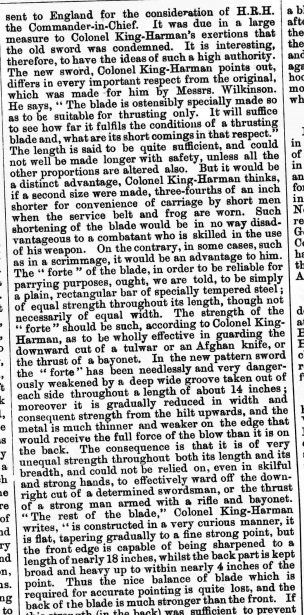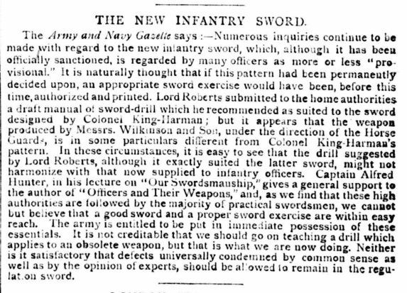 From St. James' Gazette of 3 April 1893 (note - Hunter mentioned here is actually Captain Alfred Hutton) - the journalist wrongly attributed the new regulation sword design to Colonel King-Harman, no doubt because King-Harman in his own writings had implied that his sword design and John Latham's copy of it were the inspiration for the new regulation sword, despite them being fairly different looking blades and hilts: