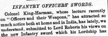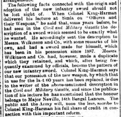 The Globe of 10 August 1892 further cements the perception that King-Harman was the originator of the new sword, by attributing the design of the new blade to King-Harman and his inspiration Major Neville of the 14th Bengal Lancers: