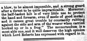 Criticism of the 1892 pattern sword's retention of the brass guard, from The Globe of 8 Sept 1894:
