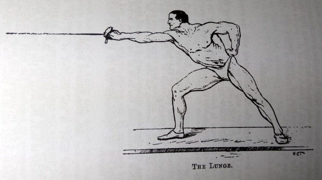 Hutton's less exagerated lunge, following the standard lunge taught in French foil, as shown in 'The Swordsman':