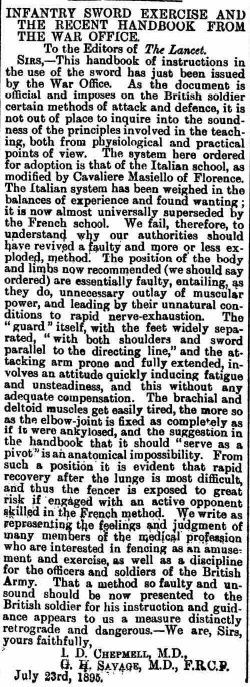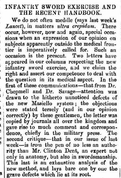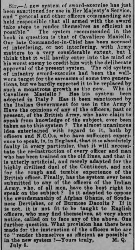 The Star, of 1 Aug 1895, featured a letter originally to the editor of the Lancet from two doctors who questioned the choice of Masiello's system for the new British Infantry Sword Exercise. They go as far as to call the system "faulty" and inferior to contemporary French methods: