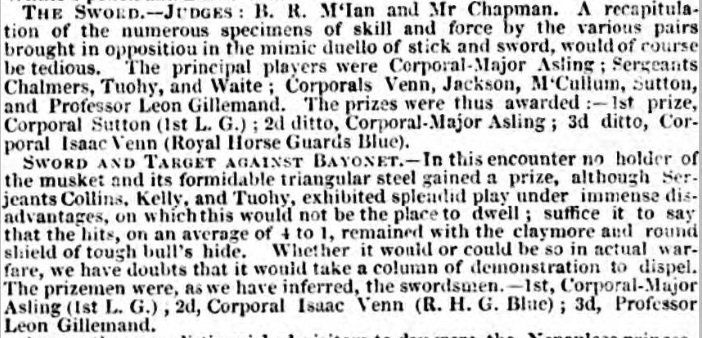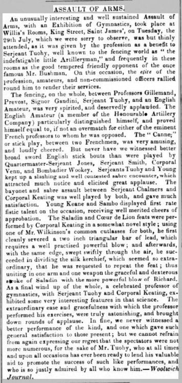Tuohy himself was fully trained in foil, broadsword and bayonet, and he is mentioned many times competing and fencing alongside some of the most highly-respected and competent fencers in Britain, including Gillemand, Shury, Chapman, Waite, Bushman, Prevost and others.