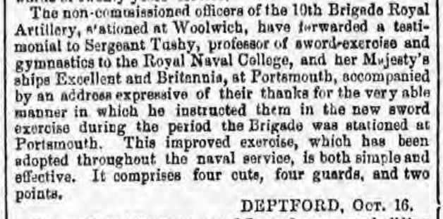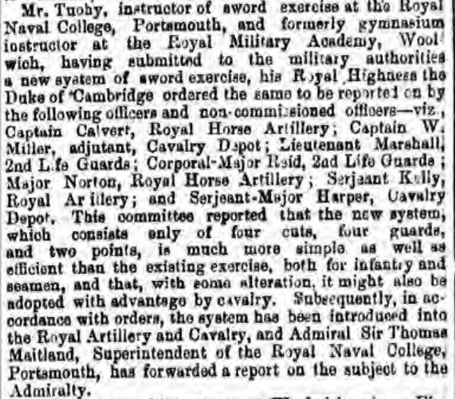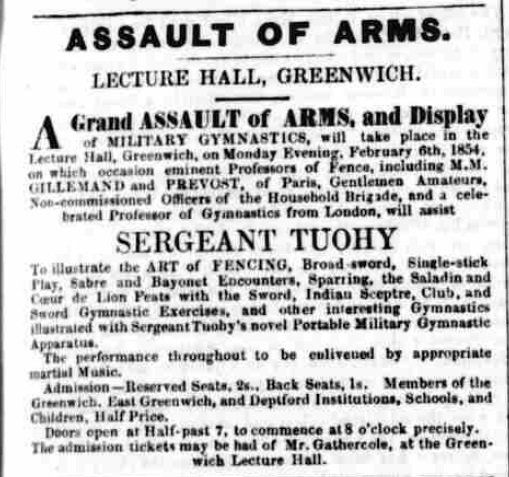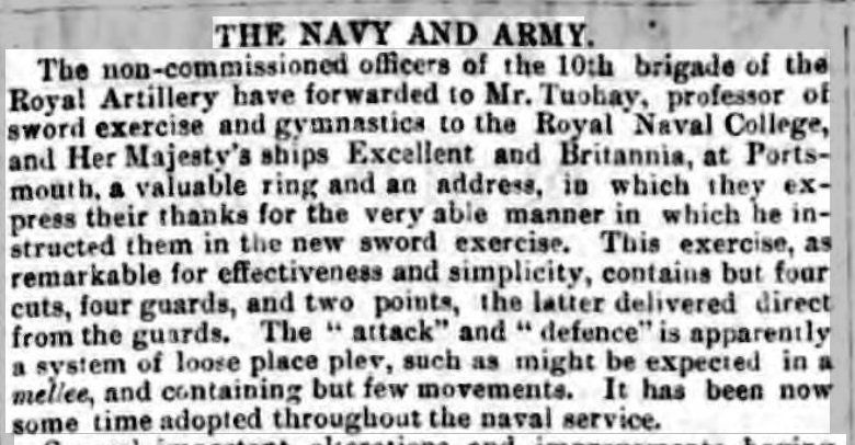 The Morning Chronicle of March 1855 records, "Sergeant Tuohy, of the Royal Artillery, who has for several years instructed the gentlemen cadets in the use of the sword and known by officers in the army."