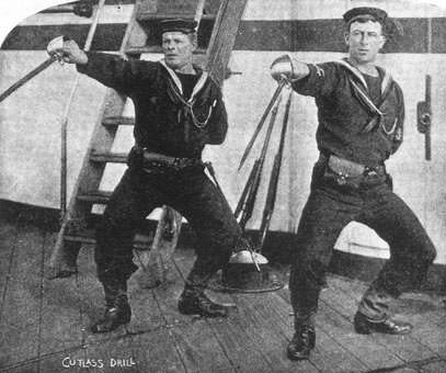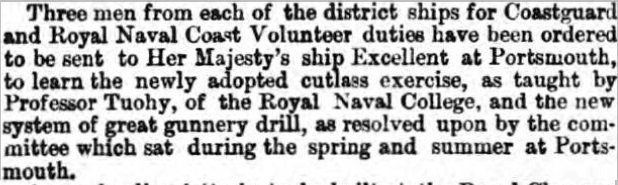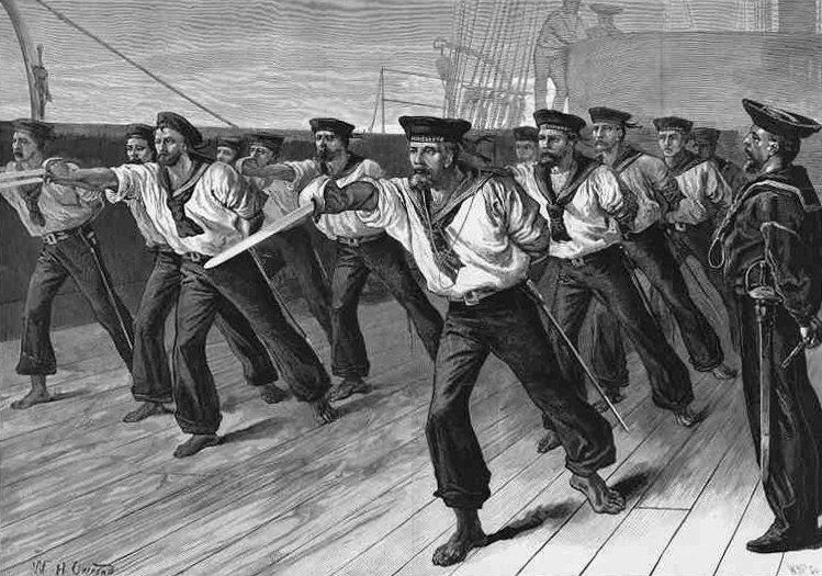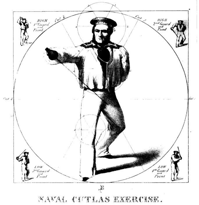 Tuohy's new or revised sword exercise was first noted around 1856, being taught at the Royal Naval College in Portsmouth, where it gained enough approbation with the authorities that it was quickly adopted as the new regulation Cutlass Exercise in around 1857. It is freely available here in the 1859 edition of the Cutlass Exercise.