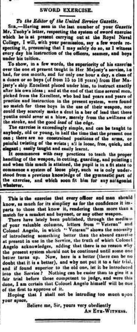 From an article in the Portsmouth Times and Naval Gazette of 29 November 1856, we can see that at that time Tuohy was promoting his new system and training boys in it, pitching it as an improvement and reasonable replacement for Angelo's then-regulation system: