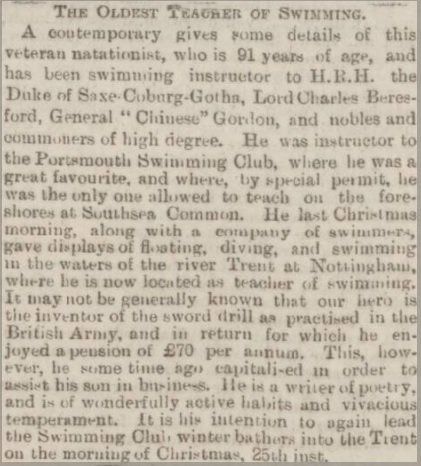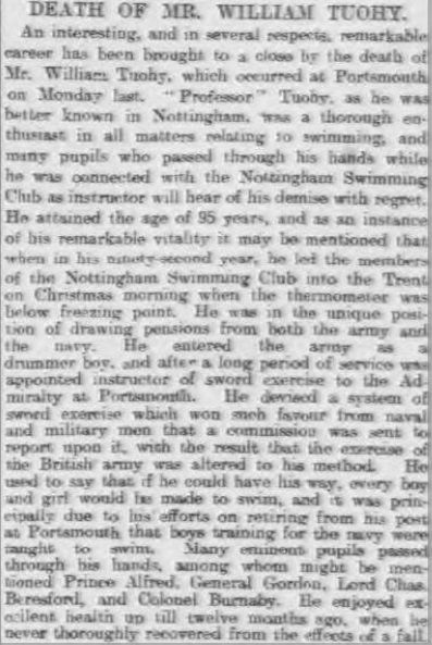 William Tuohy had obviously settled in Nottingham for quite some time, as mentioned above, though he died back in Portsmouth at the good age of 95. It is quite extraordinary to think that the same man who taught so many people swordsmanship and created the regulation system of three decades' service, also taught such an impressive array of individuals how to swim. He certainly seems to have lived a full life.