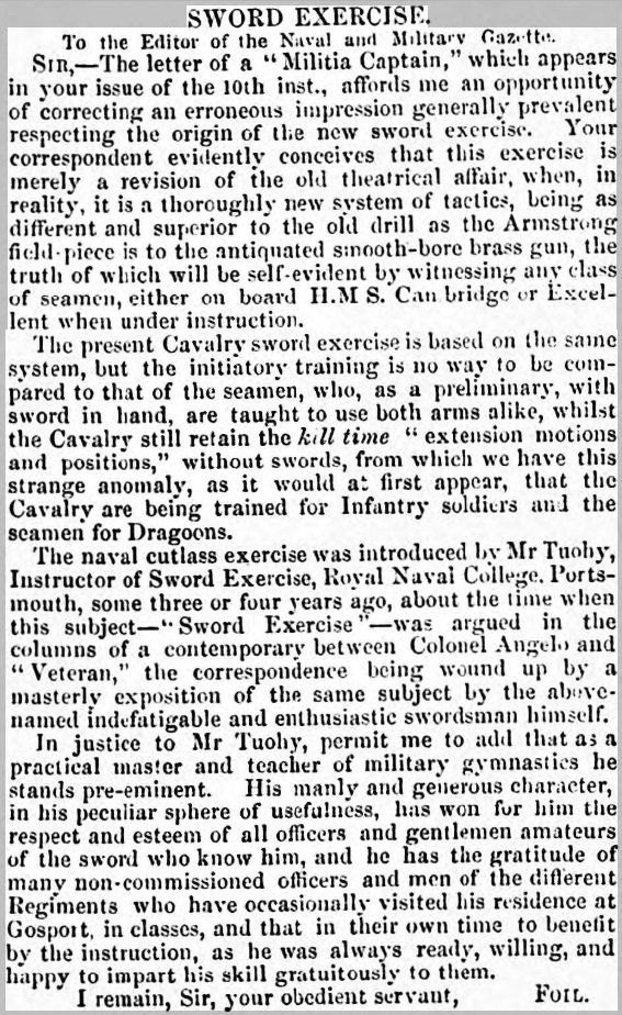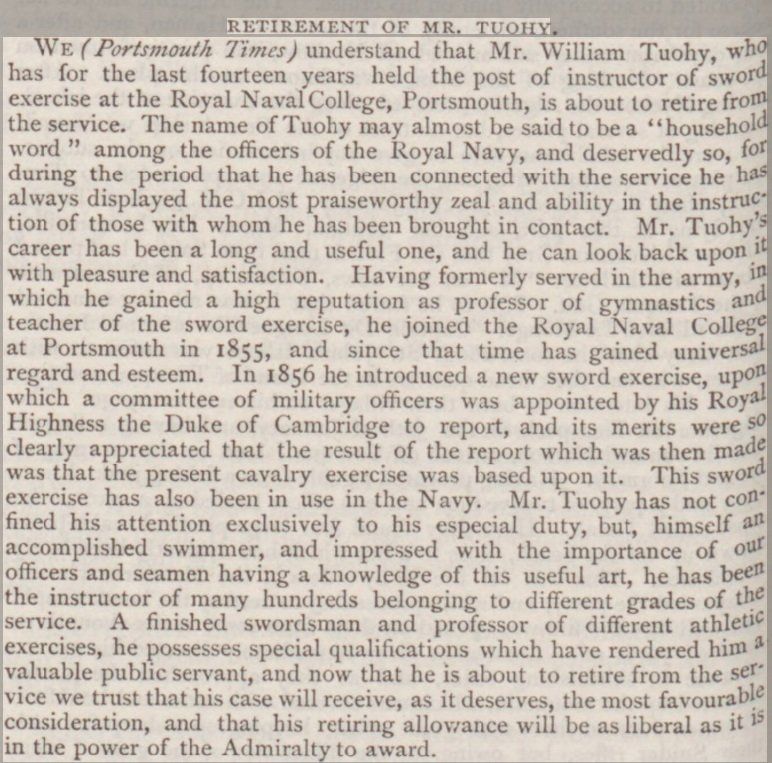 Tuohy was known by hundreds of sailors and soldiers of the Royal Navy and British Army, as the source of the revised or new sword exercise in the mid-19th century. He personally taught scores and probably hundreds of them. He taught other instructors who went on to teach thousands of sailors and soldiers. I have 'rediscovered' him in the records and seek to give his name and memory due credit here.