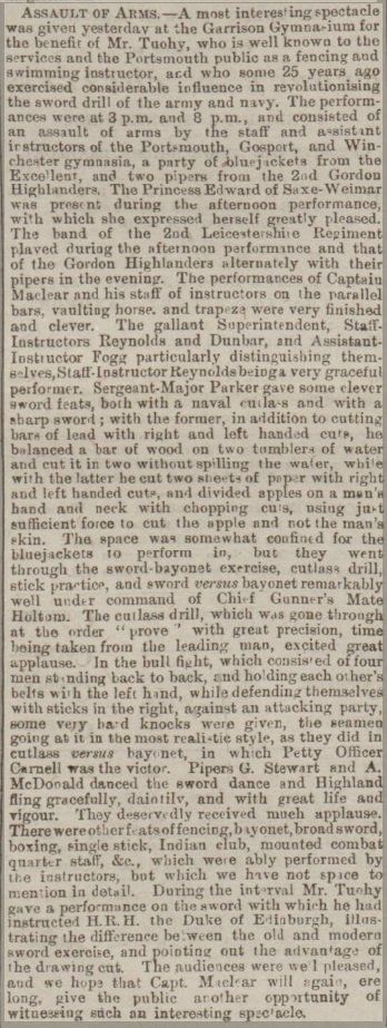 It was mentioned already in passing in the Portsmouth Evening News article of 13 May 1882 above that Tuohy had instructed H. R. H. The Duke of Edinburgh in the sword exercise. This makes sense, given that The Duke of Edinburgh, Prince Alfred Ernest Albert, born the fourth child of Queen Victoria, was a Royal Navy officer. Incredibly, he passed the examination in August 1858 and was made a midshipman on HMS Euryalus at only the age of 14, being promoted to Lieutenant in 1863. He must have undergone a period of training in swordsmanship, perhaps repeated, under Tuohy at the Royal Naval College during this period.